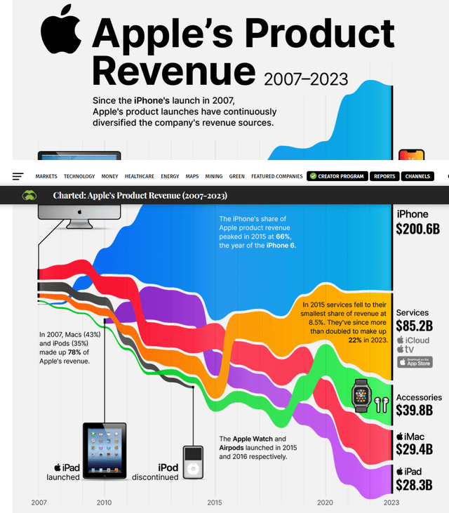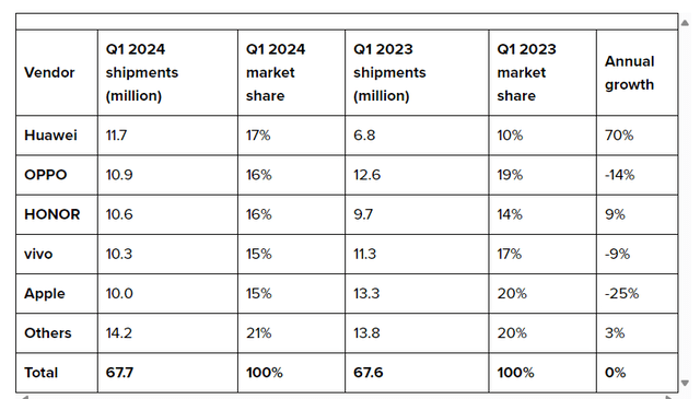 Apple은 10여년 전에 제조 능력의 상당 부분을 중국에 아웃소싱했으며 중국에서 엄청난 영향력을 발휘하고 있습니다. 또한 2023년 중국에서 700억 달러 이상의 매출을 올렸습니다. Apple보다 중국에 더 많이 노출된 기술 회사는 없습니다. 애플의 스마트폰 시장 점유율은 2024년 1분기에 크게 하락했지만 여전히 15%에 머물고 있습니다.