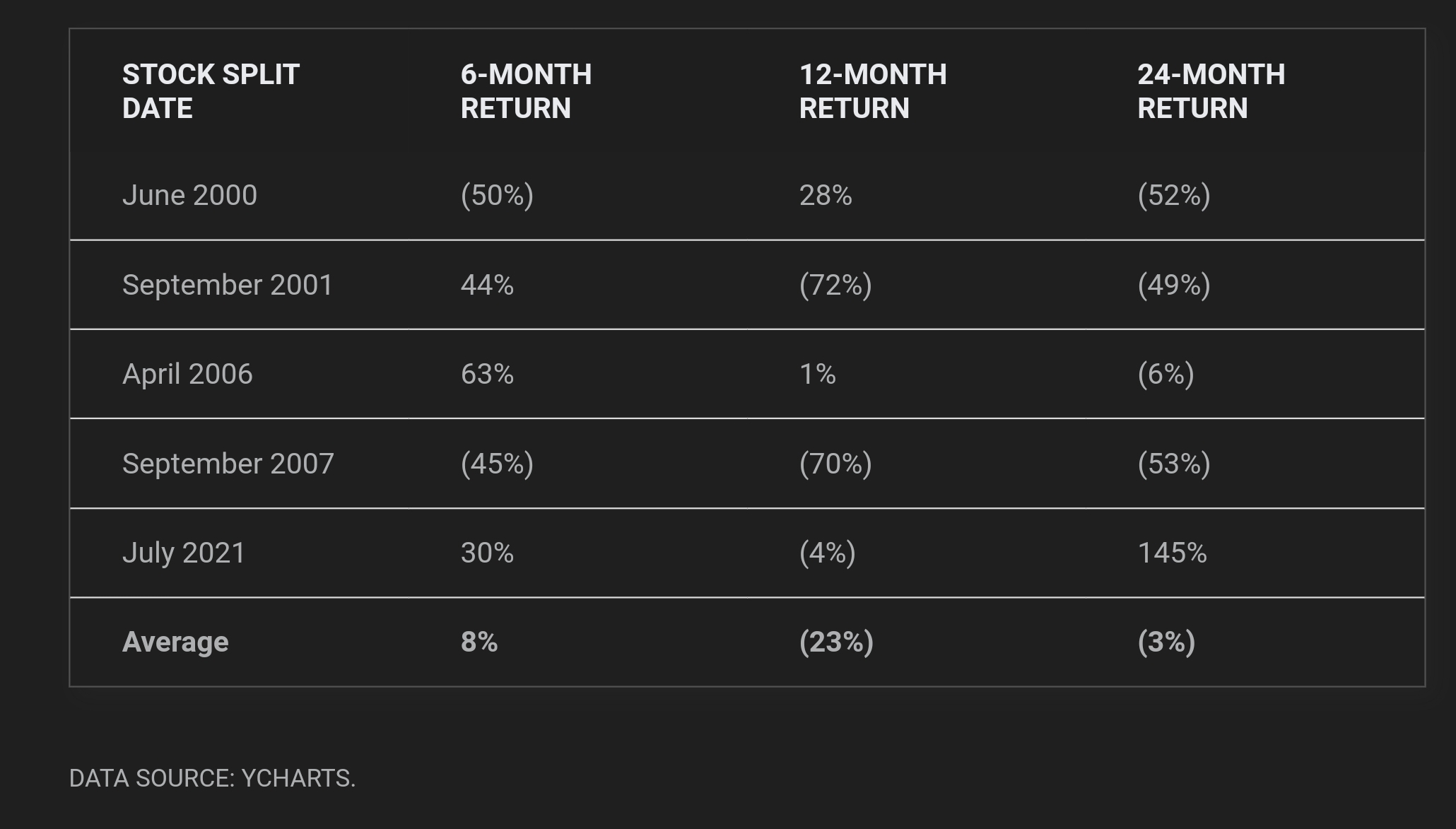 Nvidia has completed five stock splits (excluding the recent one) since going public in 1999, and shares have consistently declined in the following 12-month and 24-month periods.